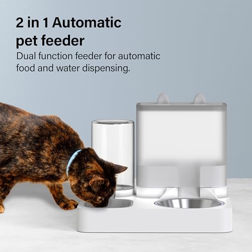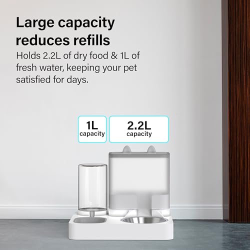 Automatic Pet Feeder Gravity cat feeder and Water dispenser natural gravity water supply and feeding system,eco friendly Pet food dispenser to provide you with a convenient and simple way of pet feeding.Food can be provided to pets anywhere. 2 in 1 Automatic Feeder This automatic feeder adopts a two in one design, 1 feeder, 1 drinker, has a 1L water bucket capacity and a grain capacity of around 2.2L,keep water food fresh .To meet the pet daily feeding needs,can be used both indoor and outdoor. Pet Safe Material Our pets water dispenser is made of high quality food grade PP,thick texture,non toxic,no strange smell,sturdy,please feel free to use,and durable for long time use. Easy To Use Clean 45 degree carefully slope design of the dog food bowls, let the right amount of food fall The base of the water bowl also has a water stopper to prevent your cats chin from getting wet Barrel and chassis can be split, you can rinse directly with water.