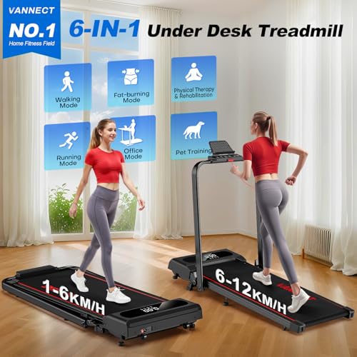 𝟔-𝐢𝐧-𝟏 𝐓𝐫𝐞𝐚𝐝𝐦𝐢𝐥𝐥𝐬 𝐟𝐨𝐫 𝐇𝐨𝐦𝐞 𝐟𝐨𝐥𝐝𝐚𝐛𝐥𝐞 𝐰𝐢𝐭𝐡 𝟗% 𝐈𝐧𝐜𝐥𝐢𝐧𝐞: The vannect walking pad foldable is suitable for at least six different training scenarios, including fat burning mode, walking mode, running mode, office mode, physical therapy and rehabilitation, and pet training. After folding the armrests, it can be used as a walking mat under the desk, with a speed range of 1-6KM/H for light exercise. After raising the armrests, it can be used as a walking pad treadmill for jogging or running, with a speed range of 1-12KM/H. This walking pad with handle also has a 9% incline, simulating mountain climbing and enhancing fat burning.
