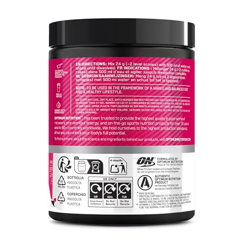 Optimum Nutrition Clear Whey Protein Isolate + Collagen is made to move with you- a refreshing and natural, fruity alternative to traditional milky protein shakes, designed to support muscle* & joints** throughout your active day. This apple and raspberry-flavoured ready-to-mix clear whey protein powder has a a crisp, refreshing taste. It blends whey protein isolate with collagen peptides, plus added vitamins C and D. Each serving provides 10 g of whey protein isolate and 10 g of collagen, providing muscle* and joint support**. Whether you’re training hard, staying active, or focusing on daily movement, this balanced protein powder with collagen fits seamlessly into your workout routine. Suitable for gym-goers, runners, or anyone focused on wellbeing, this clear whey isolate is easy to prepare and enjoy. Just mix 24 g (~2 level scoops) with 500 ml of water and shake well. Enjoy this refreshing whey protein + collagen drink throughout the day or after training as a light, convenient way to support your routine with high protein content and great taste. *Protein contributes to muscle maintenance, when used in conjunction with weight resistance training. to be used in the framework of a varied and balanced diet and a healthy lifestyle. **Vitamin C contributes to normal collagen formation for the normal function of cartilage.