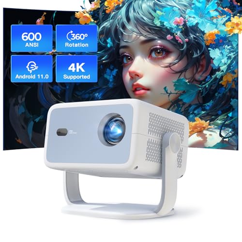 Smart 4K Projector, Auto Focus & Keystone, Native 1080P 600 ANSI Full HD High Brightness WiFi 6 Bluetooth Portable Projector 360° Rotatable Phone Projectors for Home Outdoor