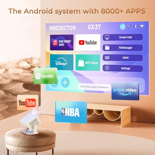 【SMART Android 4K Projector – Auto Focus & Keystone】This Smart Projector comes with built-in Android TV, giving you instant access to 10,000+ apps, 800+ free channels, and endless streaming—no extra TV stick needed. Screen mirroring from your phone (iOS/Android) lets you share videos, games, or photos in seconds.